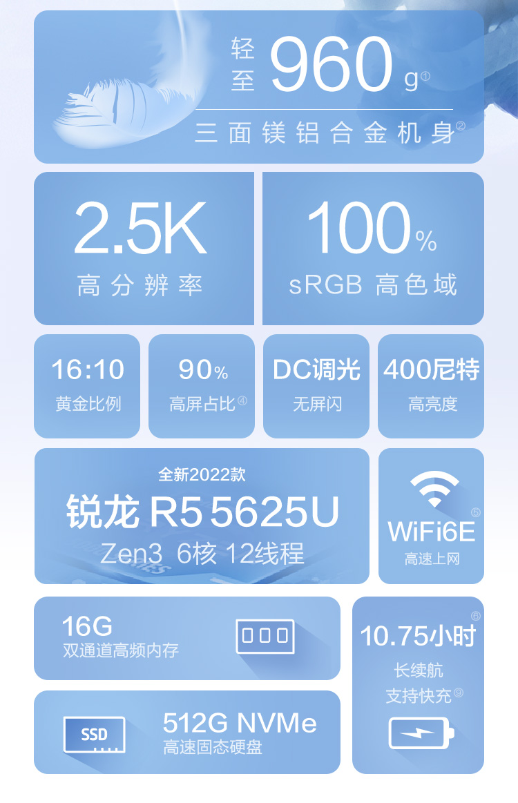 锐龙5 5625U 16G内存 512G固态硬盘 高色域 2.5k高亮炫彩屏(月光银)