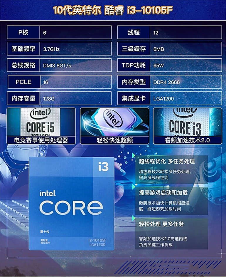 商品名称:英特尔(Intel)第10代 CPU处理器 台式机 原盒 i3-10105F 【需配独立显卡】
