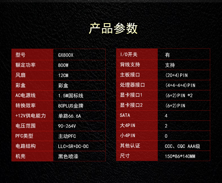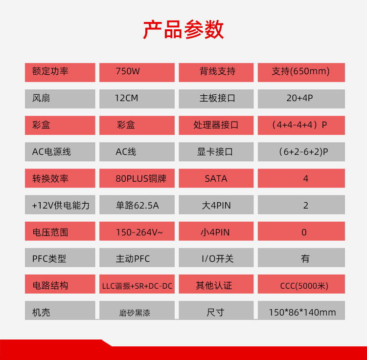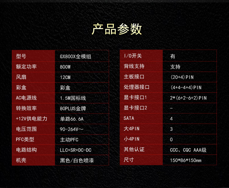 长140mm;宽150mm;高86mm 8pin PCI-E接口:2个 风扇:12cm 4个SATA接口
