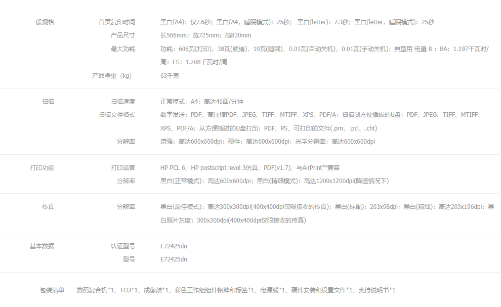 商品名称:惠普(HP)LaserJet Managed MFP E72425dn 管理型数码复合机