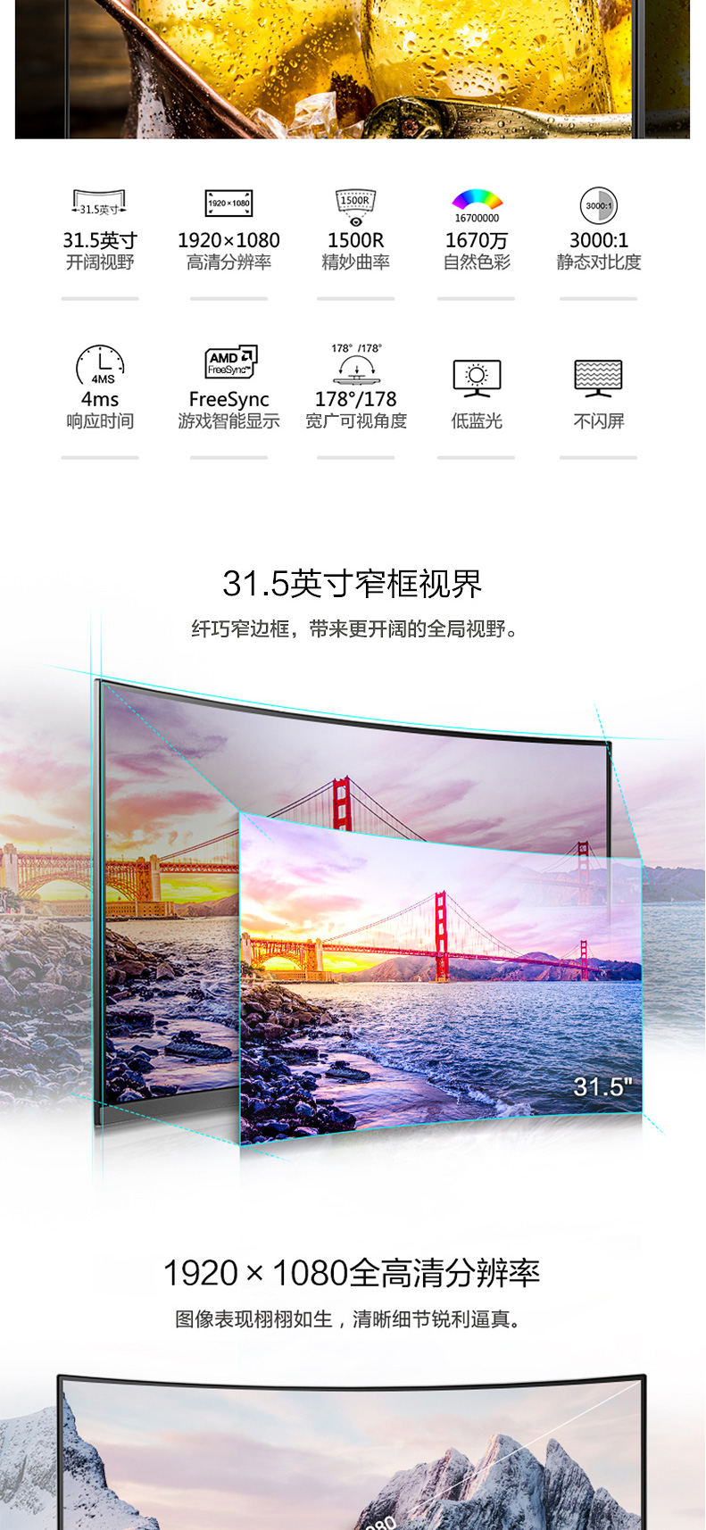 屏幕尺寸:31.5-32英寸|曲率:1500R