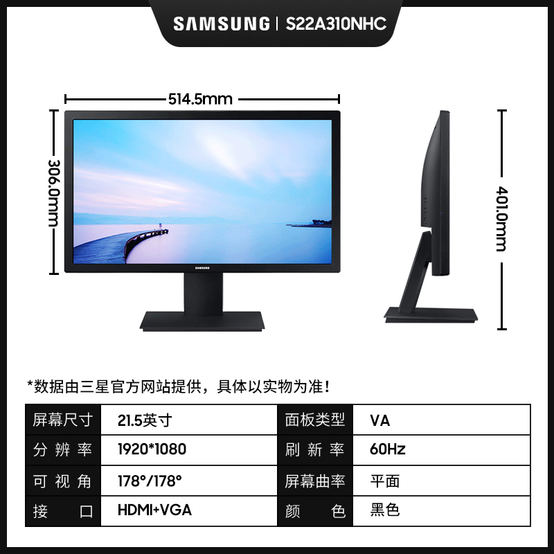 三星(SAMSUNG)电脑显示器 广视角 可壁挂 低蓝光不闪屏 HDMI S22A310 21.5英寸全高清家用办公显示屏
